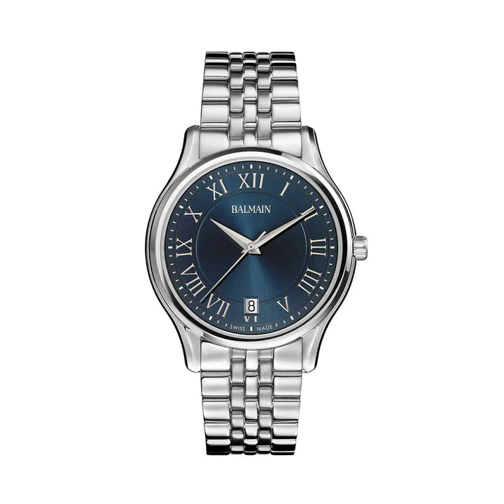 The Balmain B13413392 captures the sophistication of Swiss watchmaking in a design that radiates understated luxury. Its polished stainless steel case and refined multi-link bracelet offer a seamless, high-gloss finish, perfectly framing the captivating deep blue sunray dial. The silver-tone Roman numeral hour markers and slender hands stand out with refined clarity, creating a harmonious blend of style and readability.