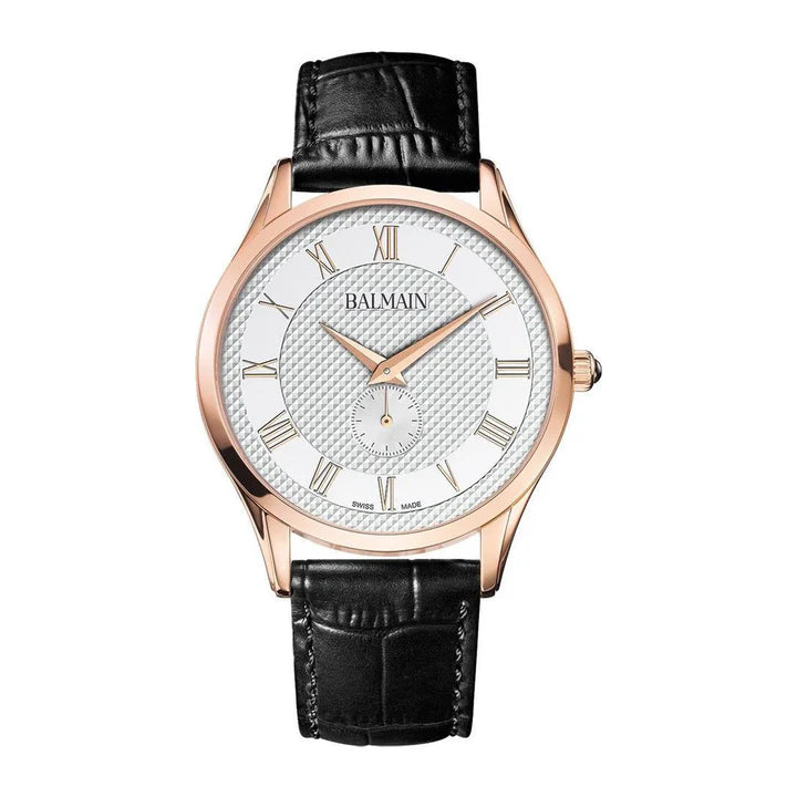 The Balmain B14293222 is the perfect marriage of timeless design and refined Swiss craftsmanship. Its rose-gold PVD stainless steel case exudes warmth and luxury, beautifully framing the silver guilloché-textured dial. The dial’s intricate pattern is complemented by rose-gold Roman numeral hour markers and slim, elegant hands, creating a balanced and distinguished appearance.
