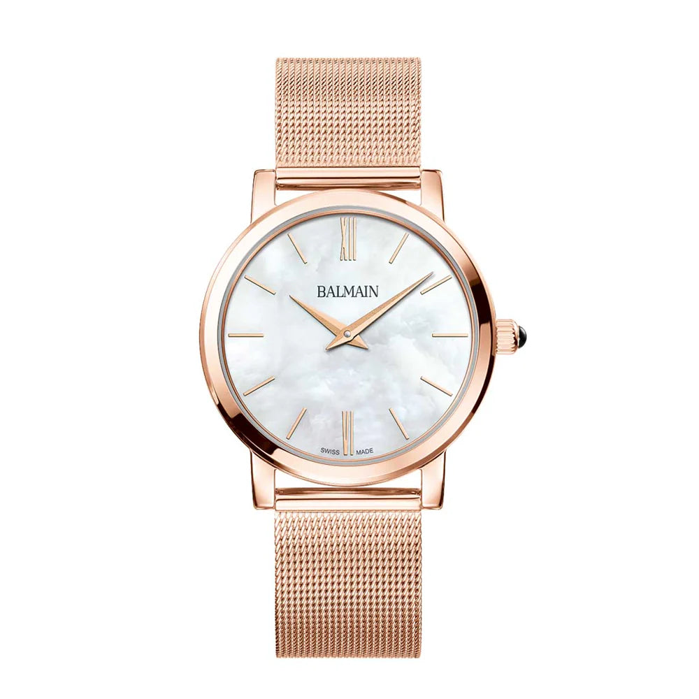 The Balmain B76993382 is a graceful ode to minimalism, presented in a full rose gold aesthetic. Its ethereal white mother-of-pearl dial radiates a soft, natural luminescence that shifts beautifully with every movement. Delicate stick indices, paired with Roman numerals at 12 and 6 o’clock, add a refined architectural rhythm to the otherwise fluid design.