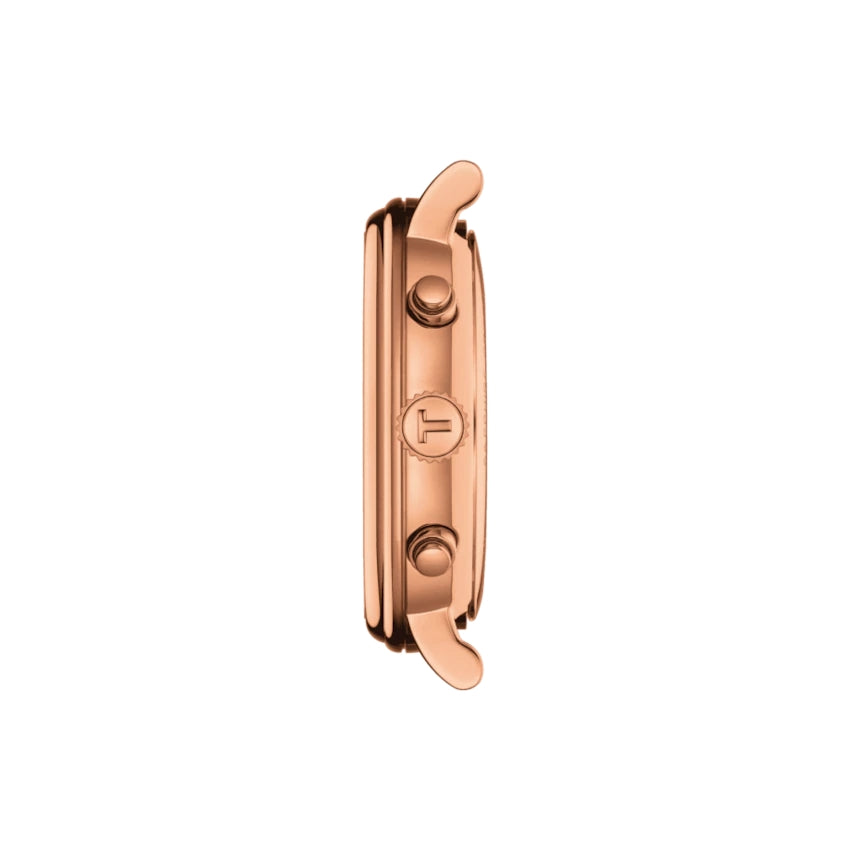 The Tissot Carson Premium Chronograph T1224173603300 exudes elegance with a timeless design that merges modern chronograph functionality and refined detailing. Housed in a rose gold PVD-coated stainless steel case, the watch showcases a clean silver dial adorned with black Roman numerals, slender gold-tone hands, and three precisely arranged sub-dials for accurate time measurement. The polished rose gold finish adds warmth and sophistication, making it ideal for both professional and formal settings.