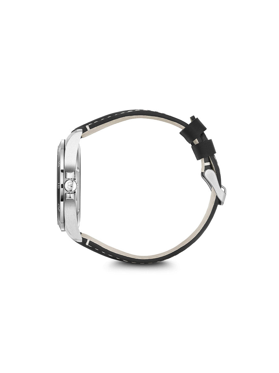 Its 43mm stainless steel case houses a striking black dial with red GMT hand, oversized white Arabic numerals, and Super-LumiNova®-enhanced hands and indexes for unmatched visibility in any light. A durable black leather strap with red stitching adds rugged sophistication, while the scratch-resistant sapphire crystal protects your time, anywhere you go.